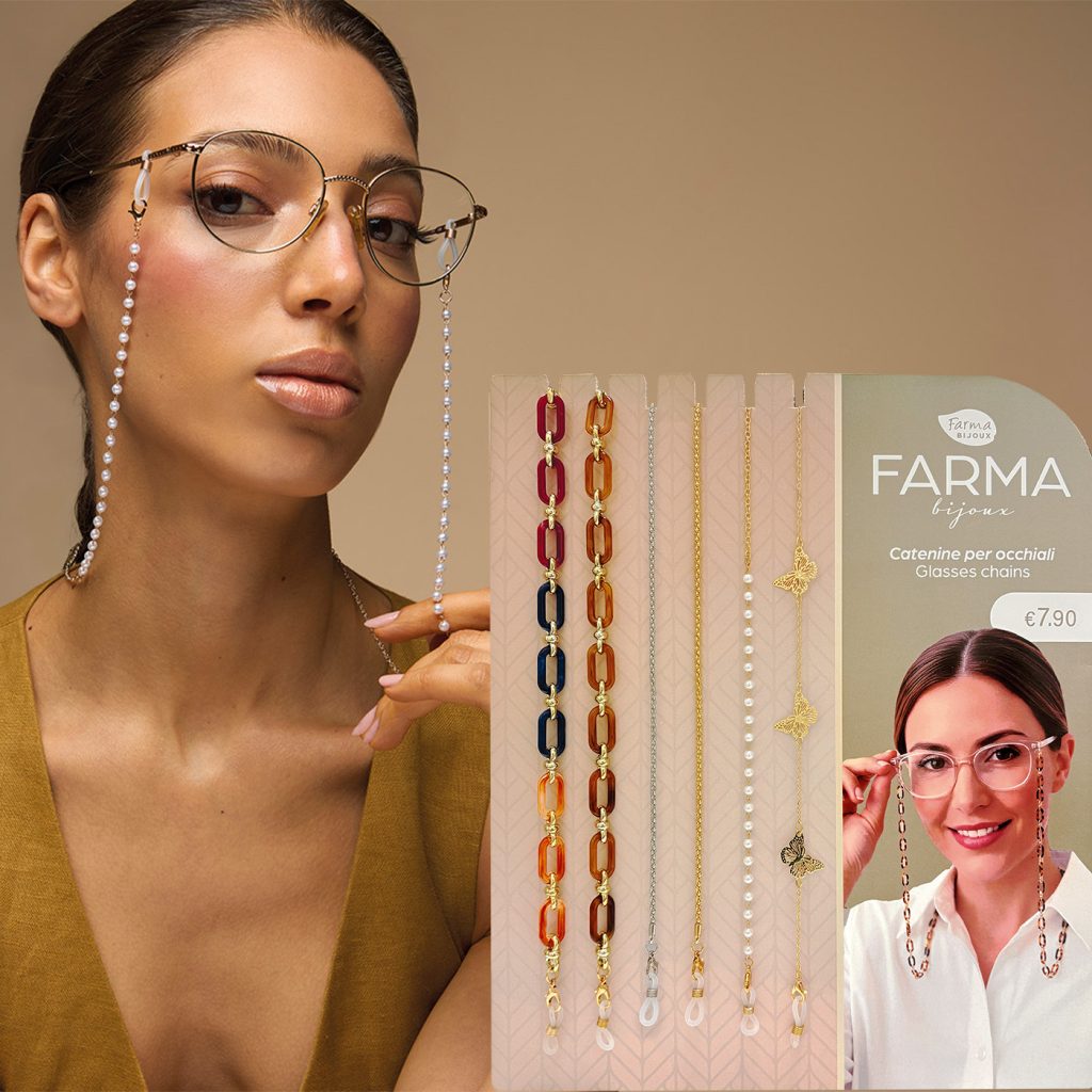 Le nuove catenine per occhiali Farma Bijoux sono l’accessorio che ti serve per trasformare il tuo look ogni giorno in modo moderno e unico. Le trovi in farmacia e parafarmacia in 6 modelli adattabili ad ogni montatura, dalle più audaci alle più sofisticate, perfette per occhiali da sole e da vista, sono leggere e Nickel tested così puoi cambiarle ogni volta che vuoi e tenere i tuoi occhiali sempre a portata di mano.